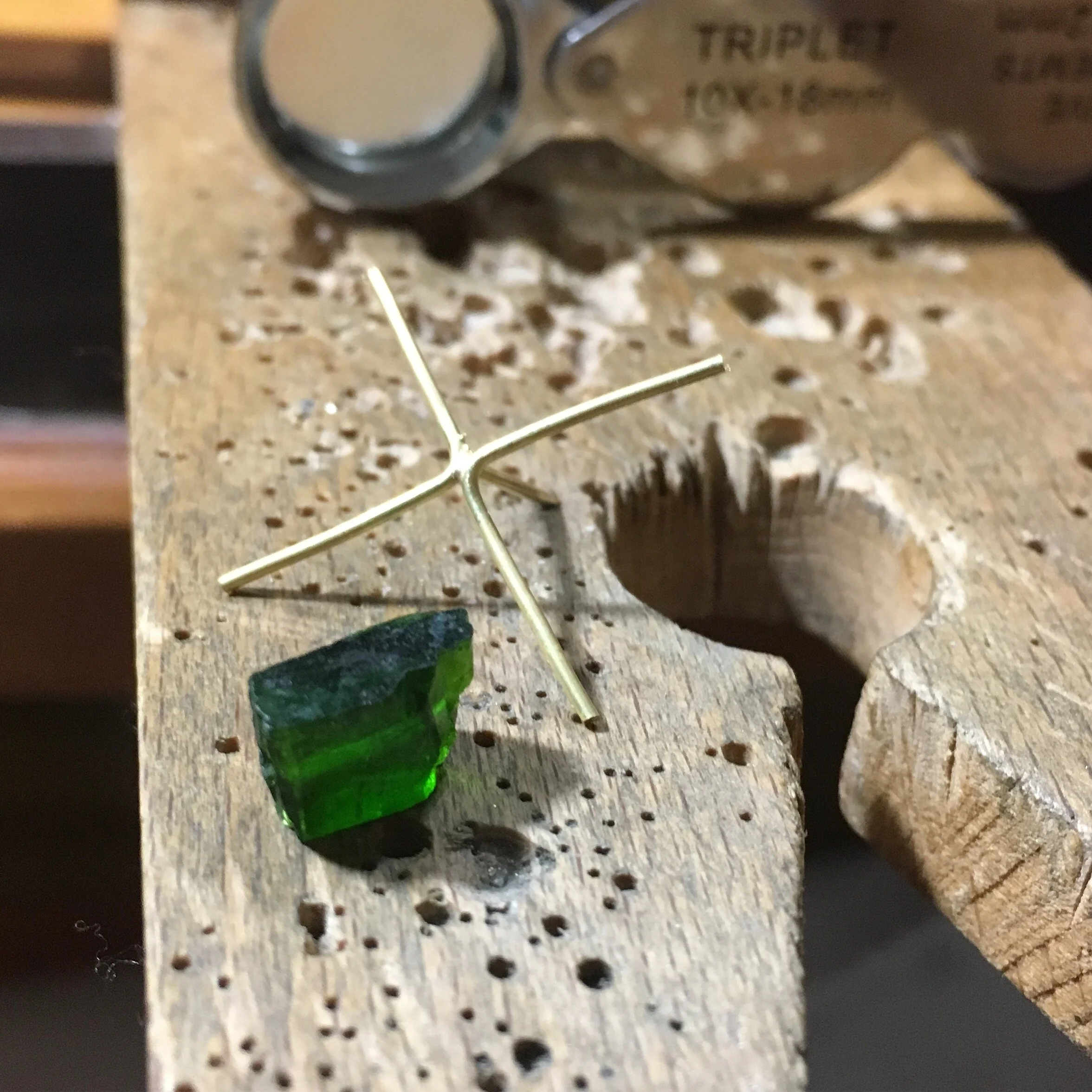 Work in progress: An 18 karat gold 4-prong setting, in its early stages, sit on jeweler Michelle Pajak-Reynolds’s workbench waiting to be set with a rough chrome diopside gem. Photo credit: Michelle Pajak-Reynolds