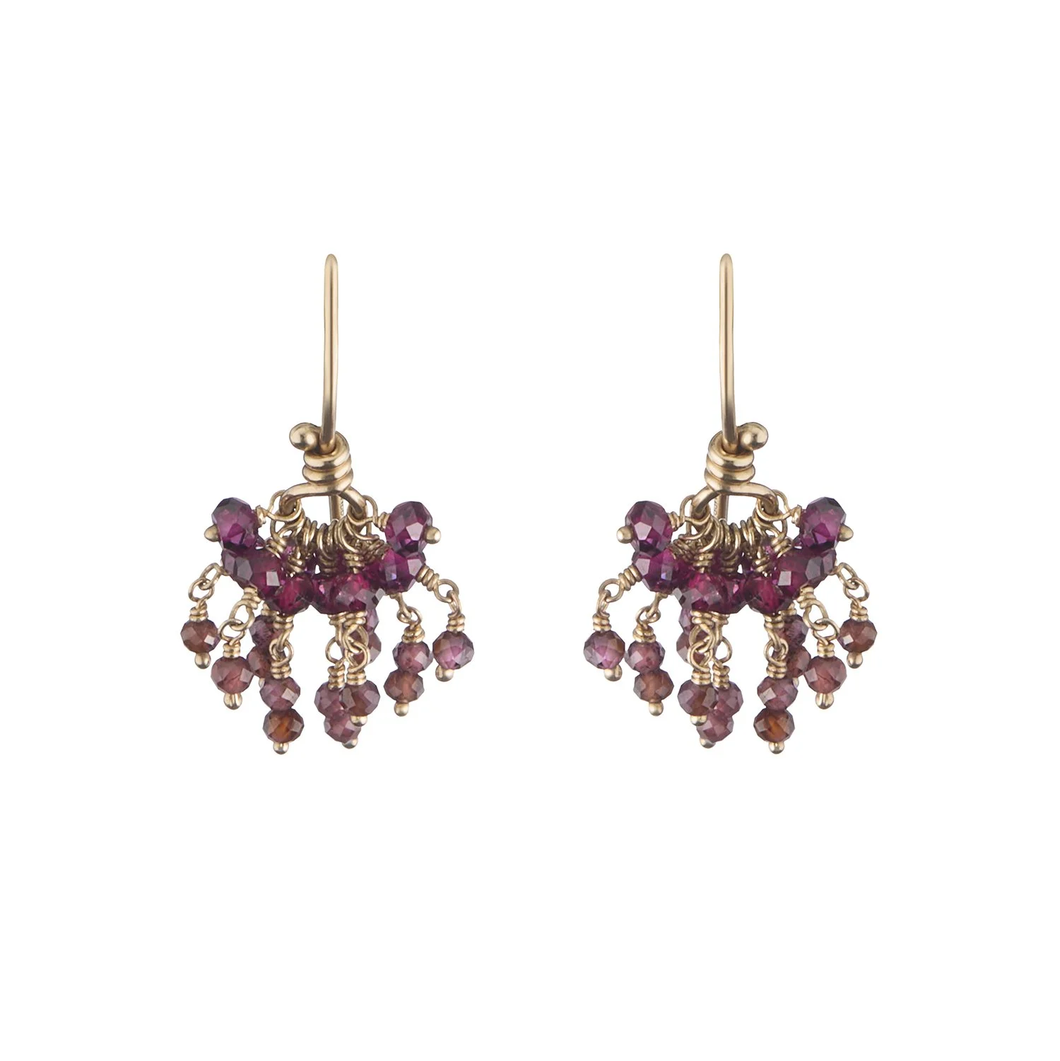Sunneva chandelier earrings from Michelle Pajak-Reynolds’s Elementals Fire Collection featuring rhodolite and pyrope garnets set in 14K Fairmined gold. Photo credit: JuleImages